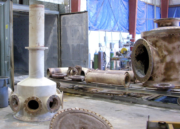 Due to the high cost of replacement parts ARM has the ability to remove the old existing rubber, ceramic, or sprayed coating to the bare metal. This is achieved in our state of the art Steelman burn oven. Product that can fit into a 10’x10’x22’ envelope can have the old metal protection removed at a minimal cost. Items that are to large can have the existing protection removed by other means. Parts then can be refurbished to new standards or patched. This realizes a substantial cost savings to the end user and prolongs the life of the part itself. After review of the wear areas, consideration can be made as to the type of protection required and adjustments made to the part as needed.