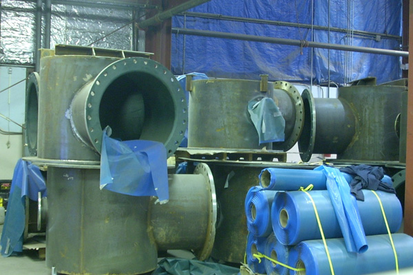 There is a wide variety of materials used in the rubber protection industry. The type of rubber protection is specific to each separate application. Rubbers to inhibit abrasion, and corrosion from harsh chemicals include: Naturals, Gum, Neoprene, EPDM, Nitrile, Ebonite, Hypalon, Triflex, MOR and Chlorobutyl. These rubbers come in different thicknesses and durometers (a measure of how hard the rubber is after being cured). Durometer ratings are critical in the rubber lining applications where abrasion and wear is a concern. Our rubber lining team has the experience and skill set to apply and cure all of the rubbers listed above.